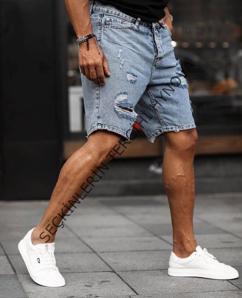 Erkek Buz Mavi Yırtık Detaylı Kot Şort