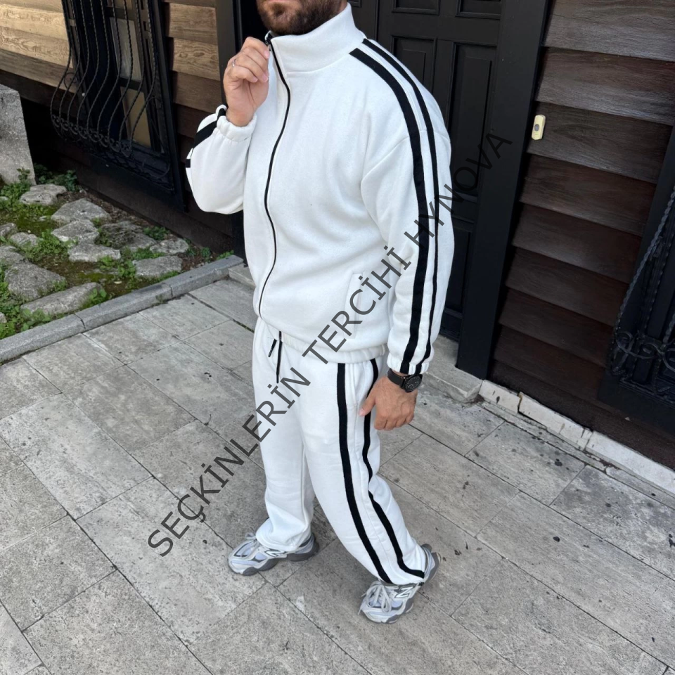 Erkek Çift Şeritli Eşofman Takım Dik Yaka Fermuarlı Sweatshirt Boru Paça Alt, Oversize 3 Iplik Pamuklu - Beyaz