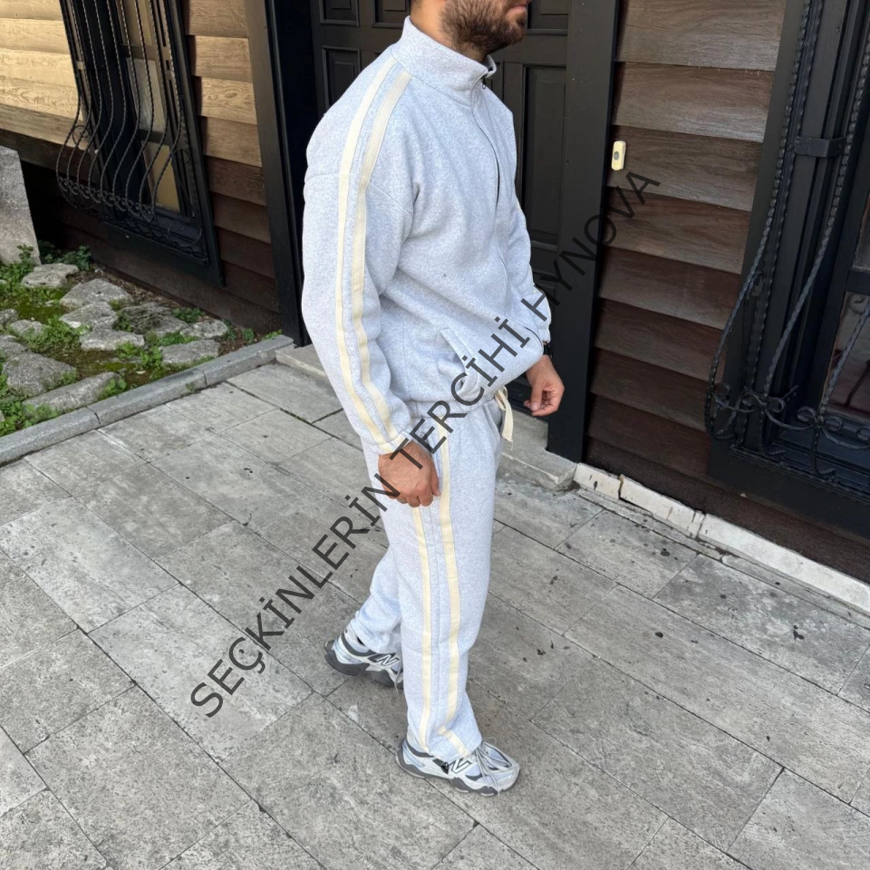 Erkek Çift Şeritli Eşofman Takım Dik Yaka Fermuarlı Sweatshirt Boru Paça Alt, Oversize 3 Iplik Pamuklu - Gri