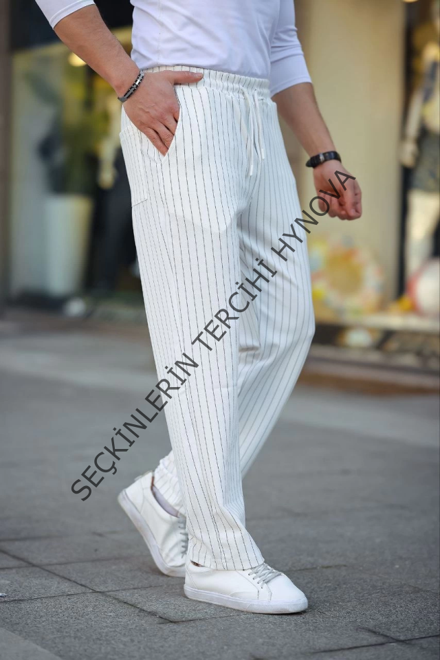 Erkek Cizgili Dokuma Krep Jogger Buggy Pantalon Rahat Kalıp - Beyaz