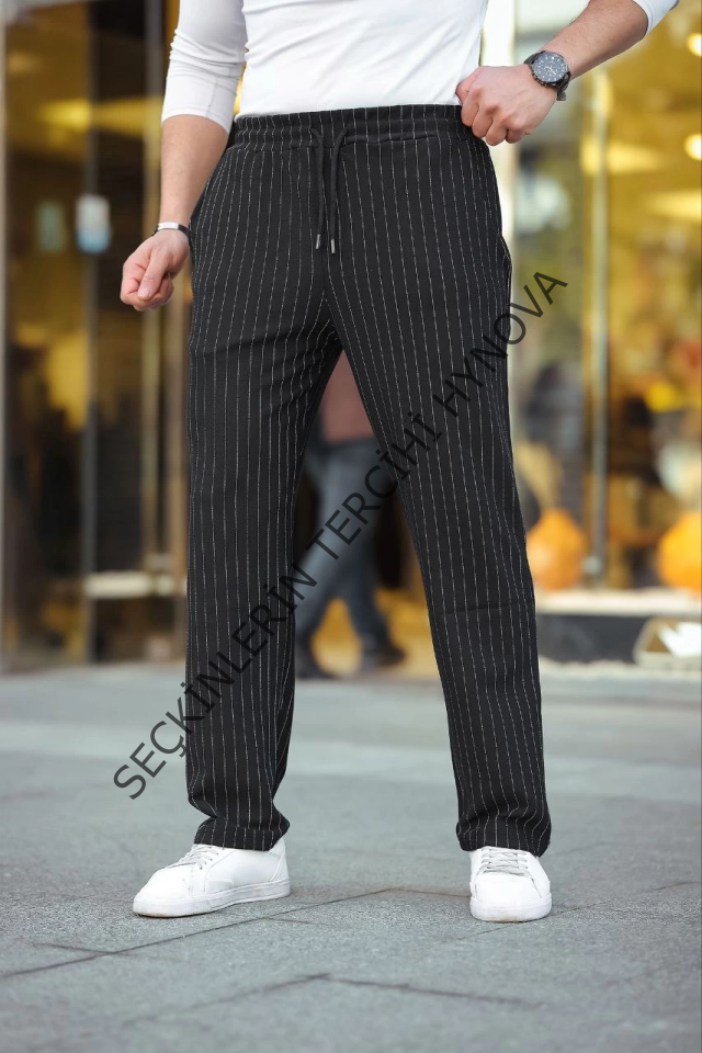 Erkek Cizgili Dokuma Krep Jogger Buggy Pantalon Rahat Kalıp - Siyah