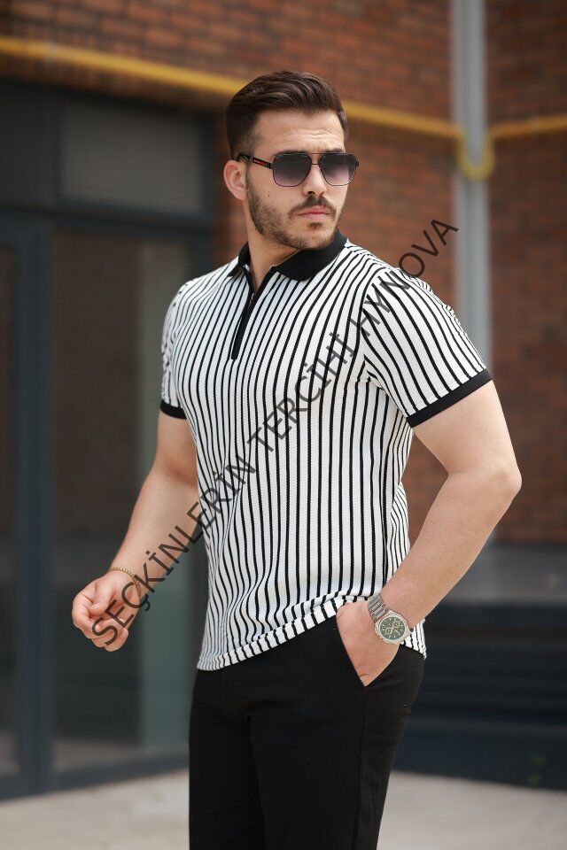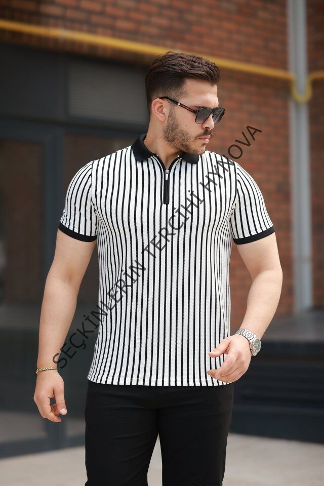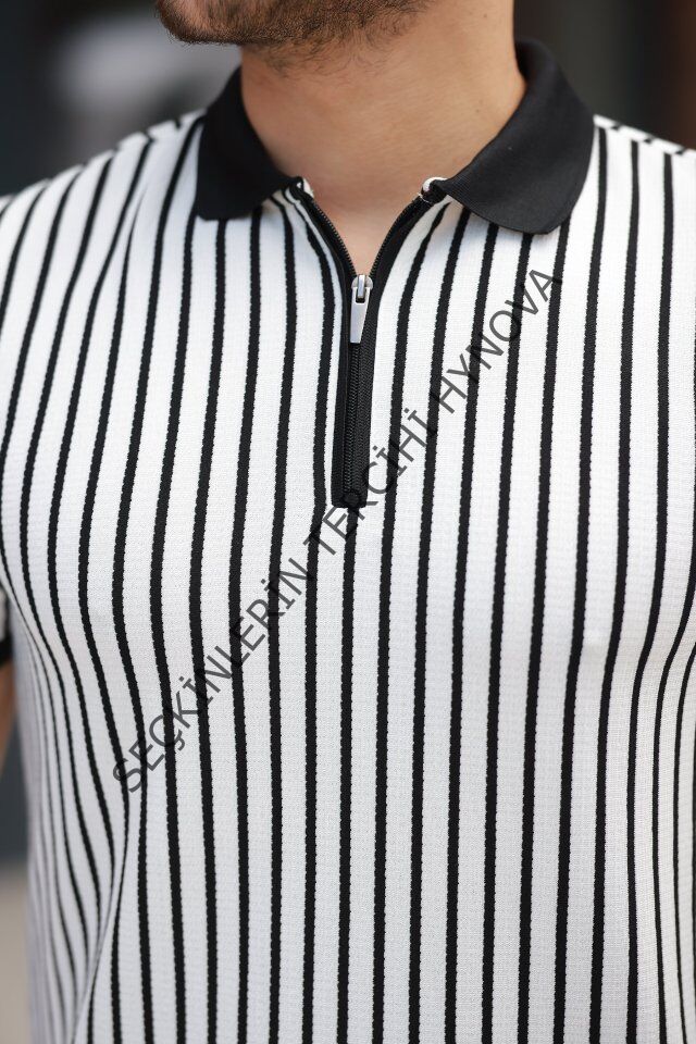 Erkek çizgili Fermuar Yakalı Kısa Kollu Tişört
