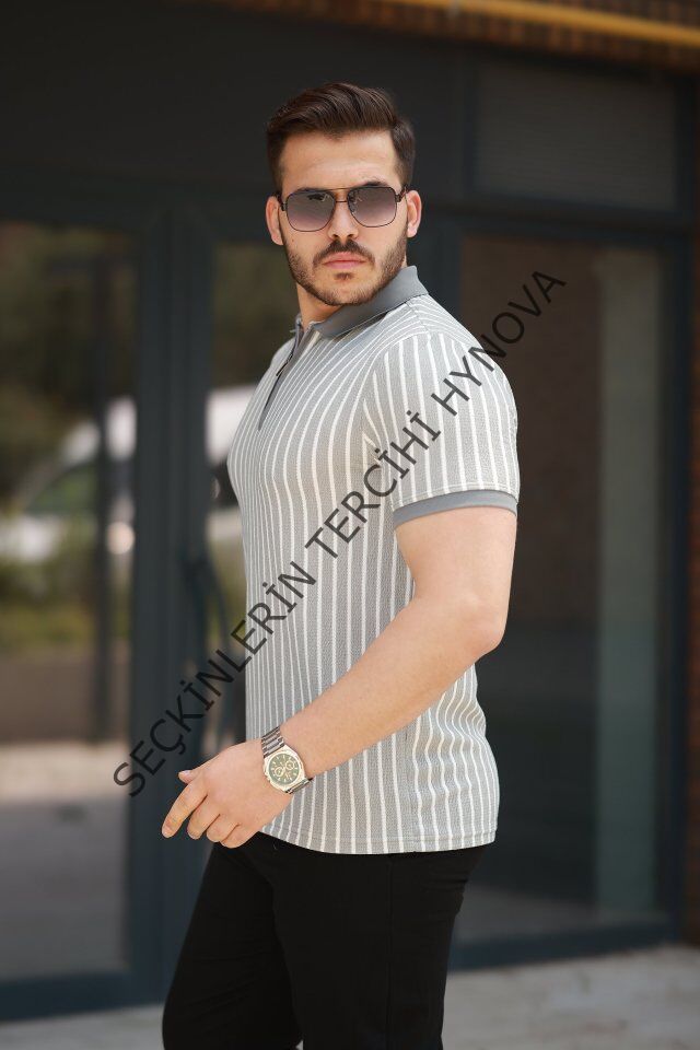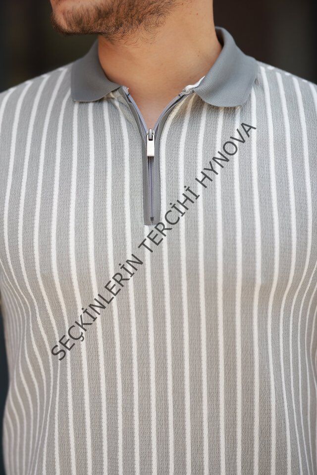 Erkek çizgili Fermuar Yakalı Kısa Kollu Tişört