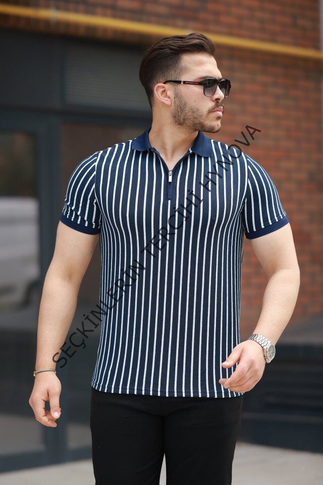 Erkek çizgili Fermuar Yakalı Kısa Kollu Tişört