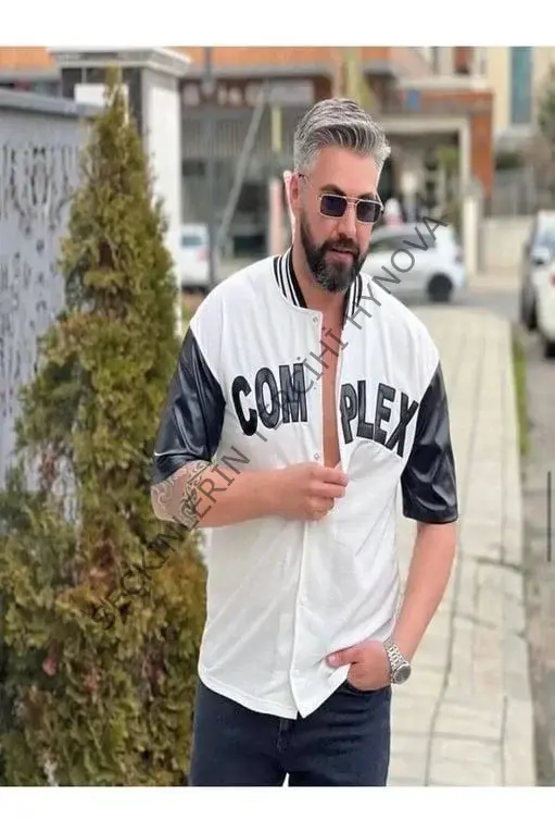 Erkek Complex Kolları Deri Kolej Oversize T-Shirt - Beyaz