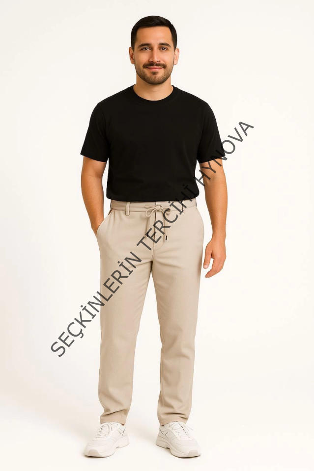 Erkek Diagonel Mikro Dokulu Cepli Pantolon - Bej