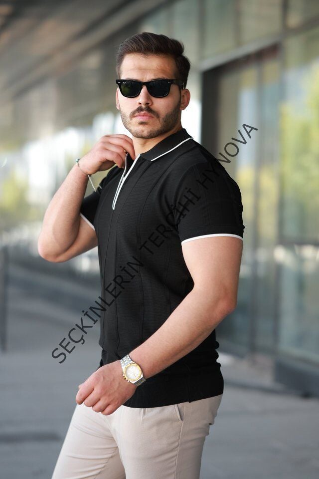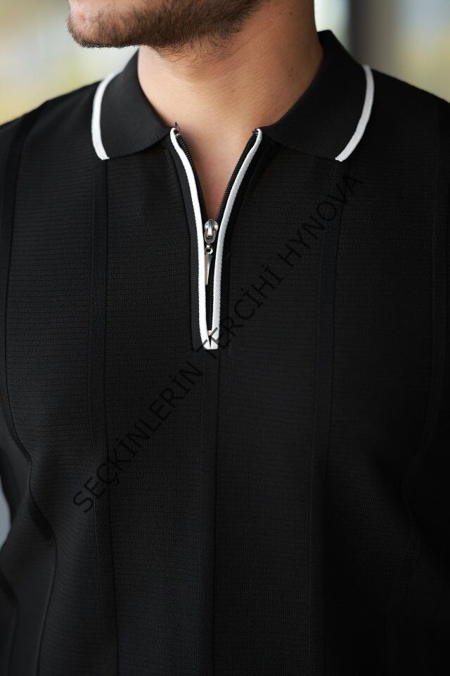 Erkek Dikey Kabartmalı Örgü Dokulu Fermuar Yakalı Tişört