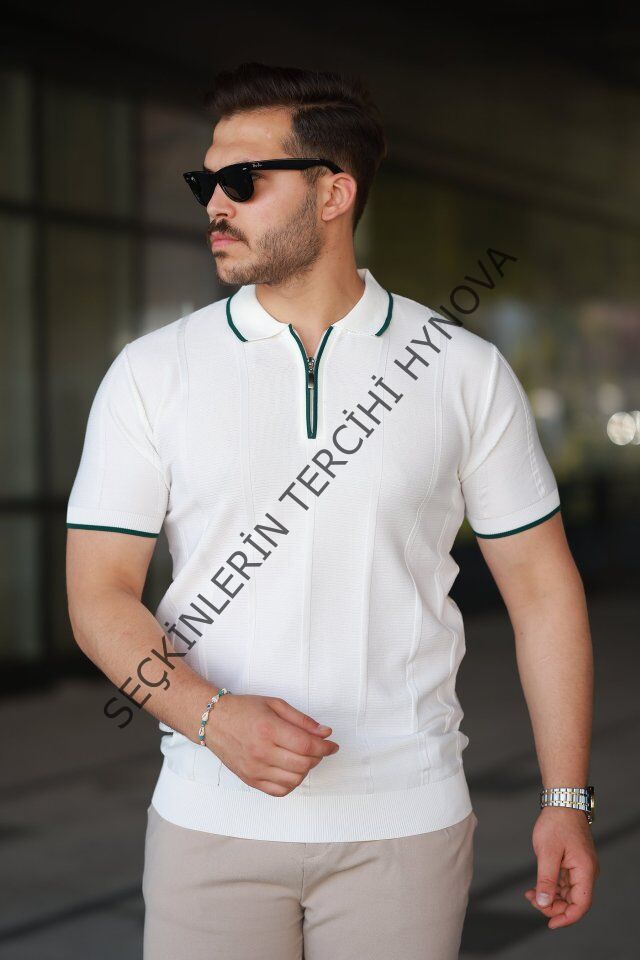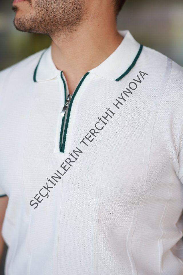 Erkek Dikey Kabartmalı Örgü Dokulu Fermuar Yakalı Tişört