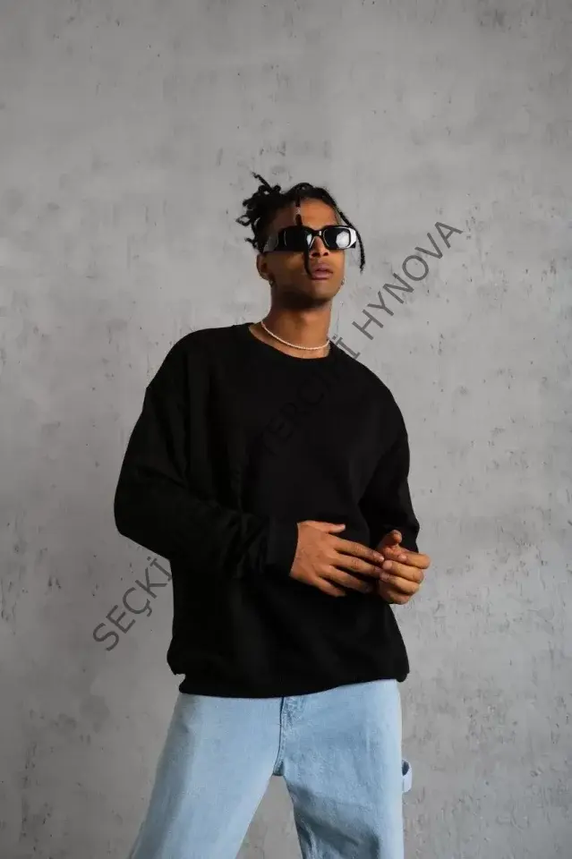 Erkek Düz Bisiklet Yaka Sweat - Siyah