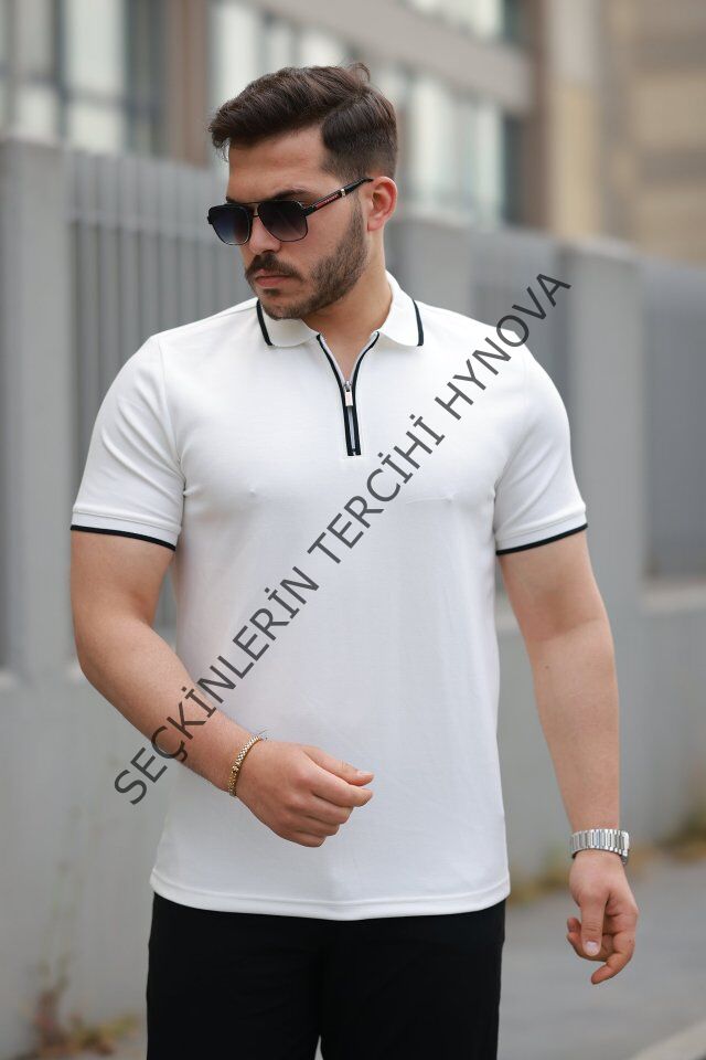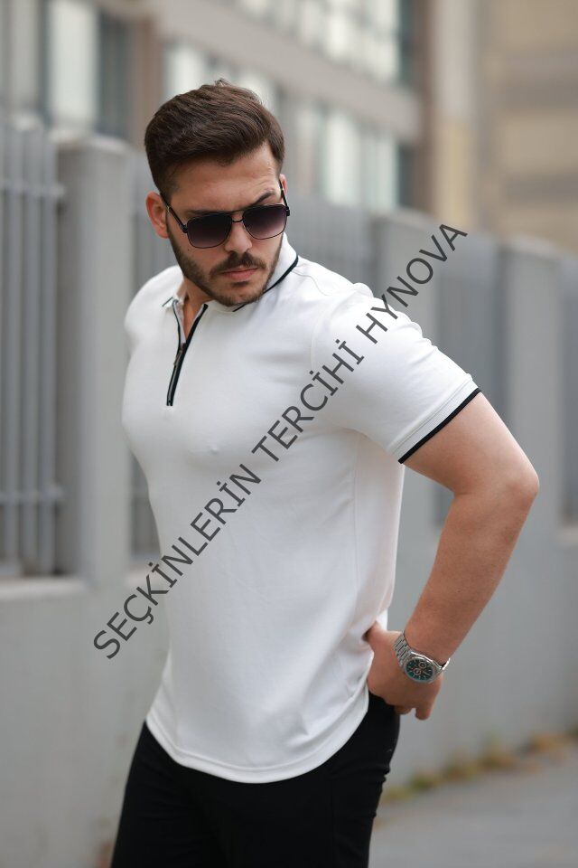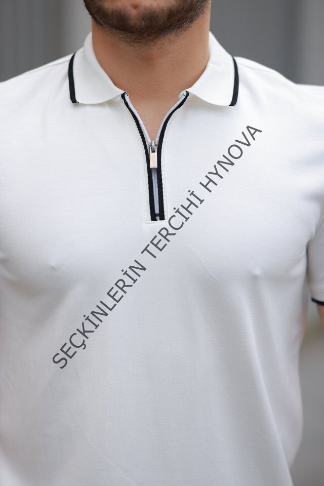 Erkek Fermuar Yakalı çizgi Detaylı Kısa Kollu Tişört