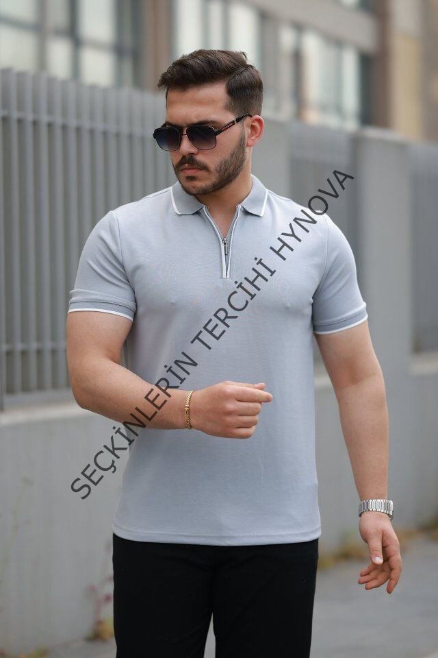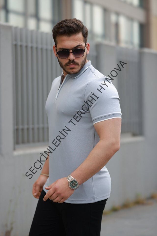 Erkek Fermuar Yakalı çizgi Detaylı Kısa Kollu Tişört