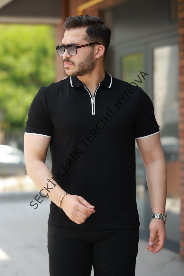 Erkek Fermuar Yakalı çizgi Detaylıkısa Kollu Tişört