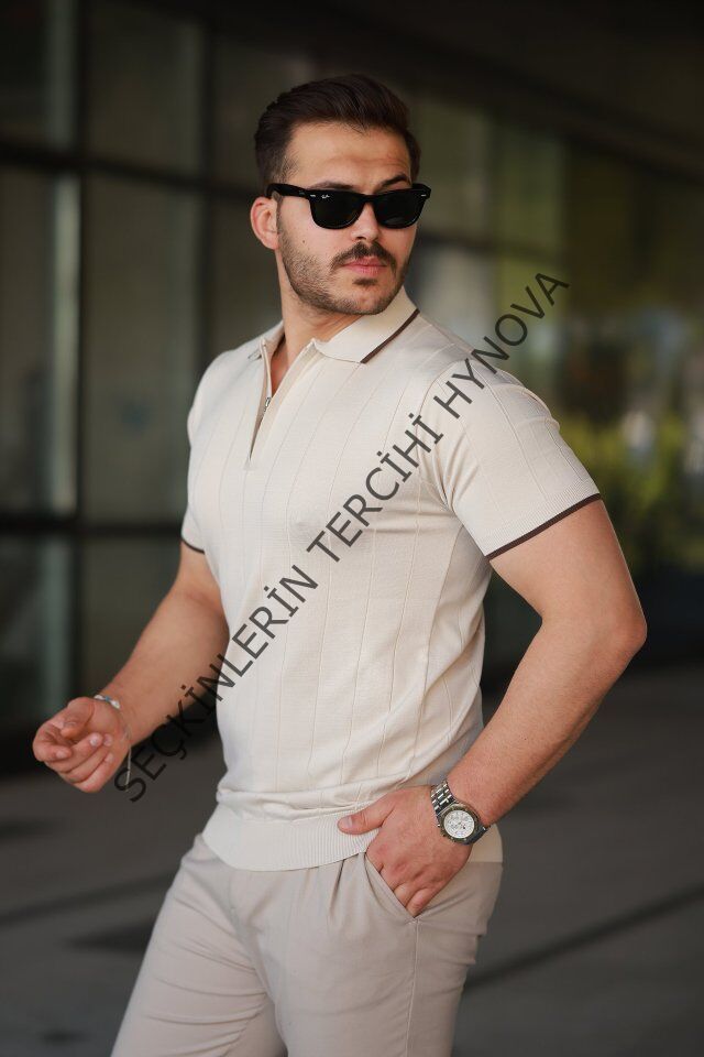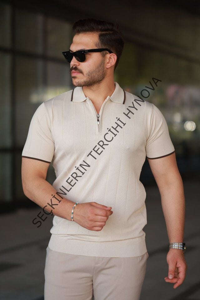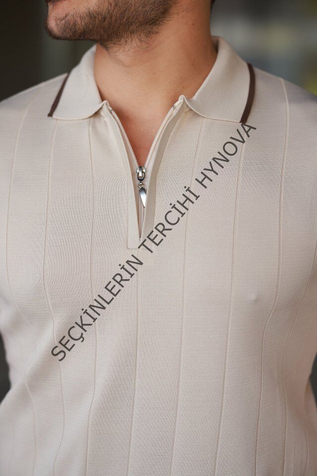 Erkek Fermuar Yakalı çizgi Dokulu Kısa Kollu Tişört