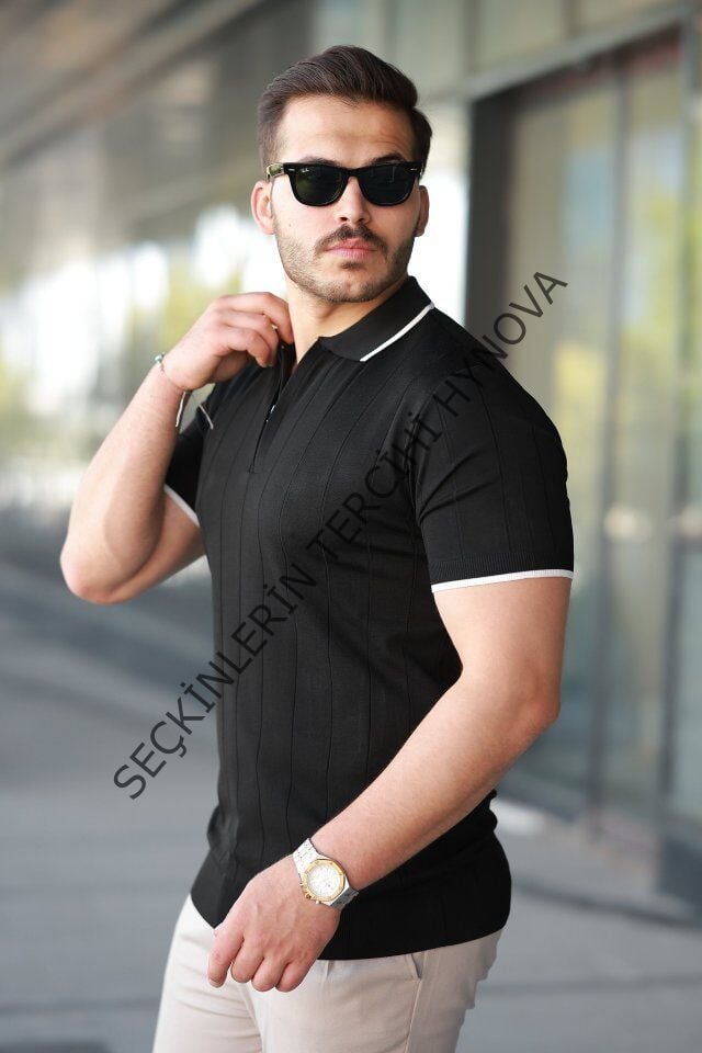 Erkek Fermuar Yakalı çizgi Dokulu Kısa Kollu Tişört