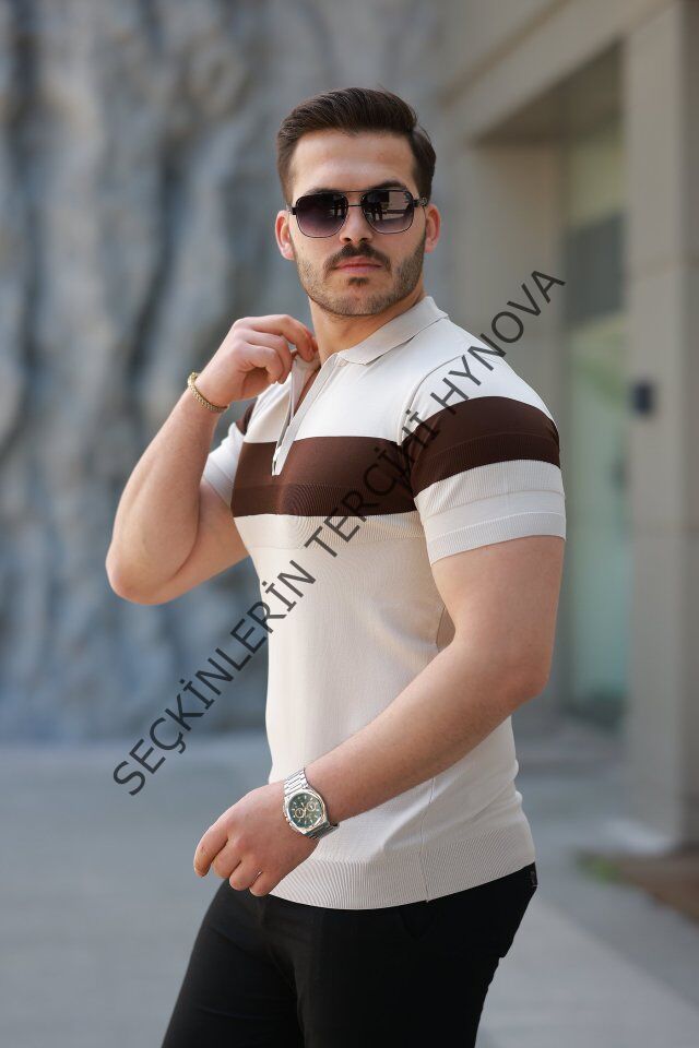 Erkek Fermuar Yakalı şerit Renk Desenli Kısa Kollu Tişört