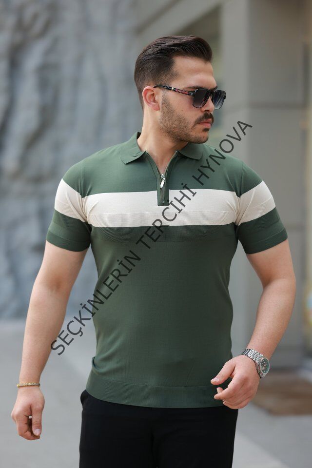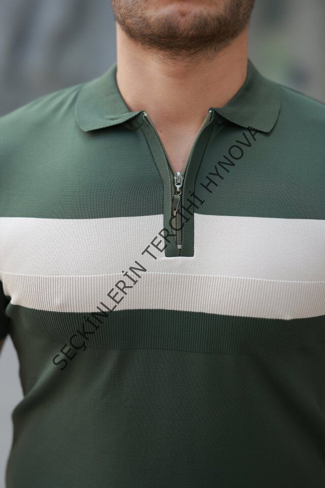 Erkek Fermuar Yakalı şerit Renk Desenli Kısa Kollu Tişört