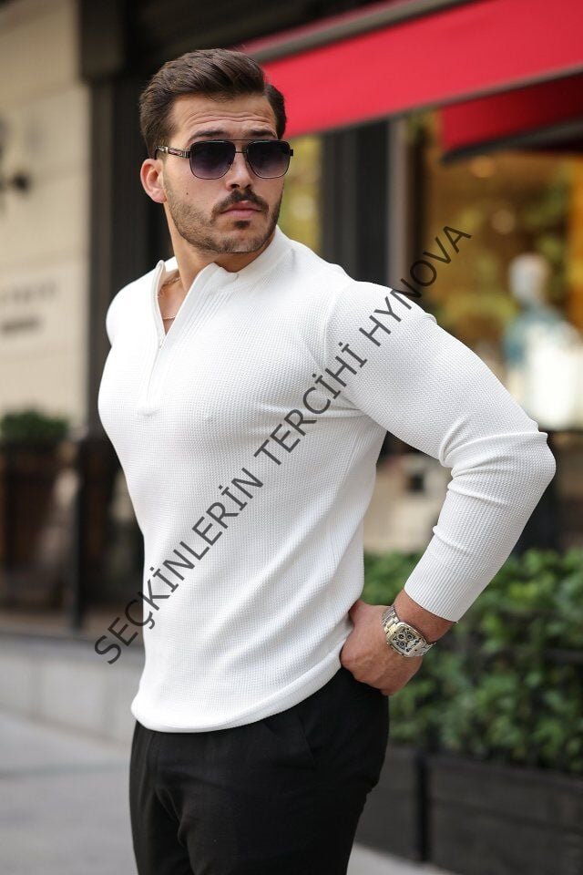Erkek Fermuarlı Bisiklet Yaka Dokulu Uzun Kollu Triko