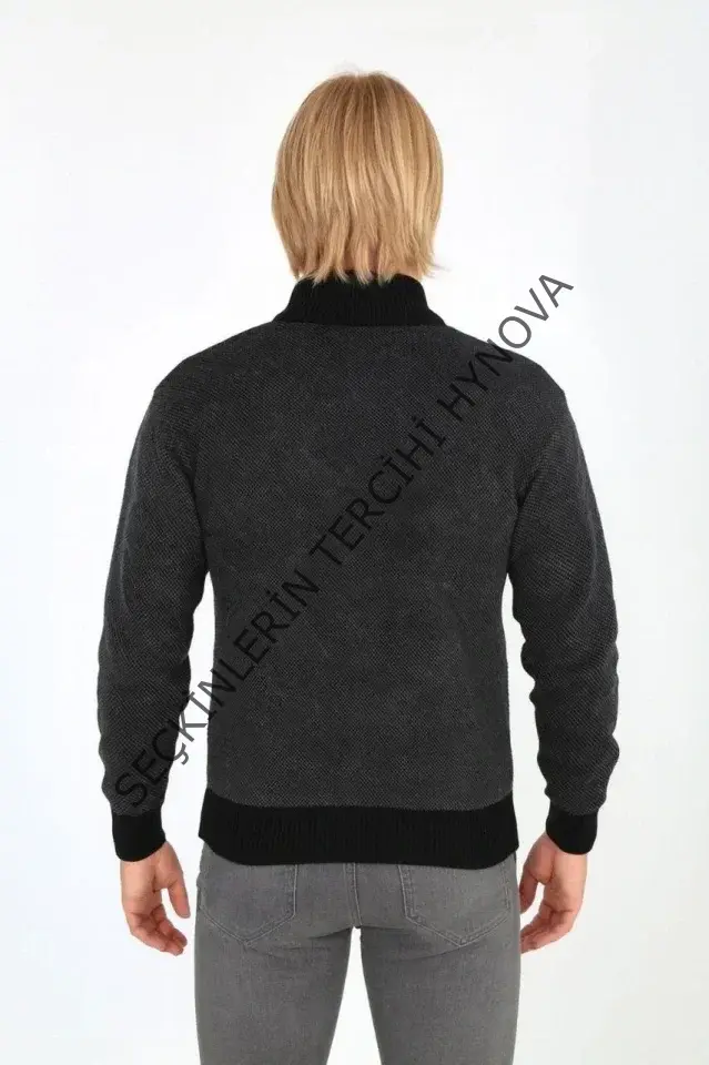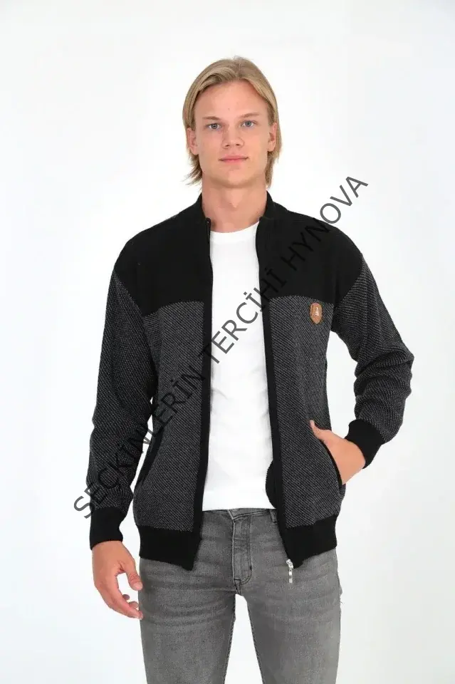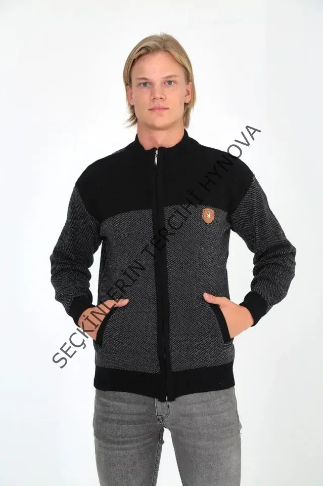 Erkek Fermuarlı Triko Hırka Yüksek Yaka, Cepli, Günlük Şık Rahat Kalıp Triko - Siyah