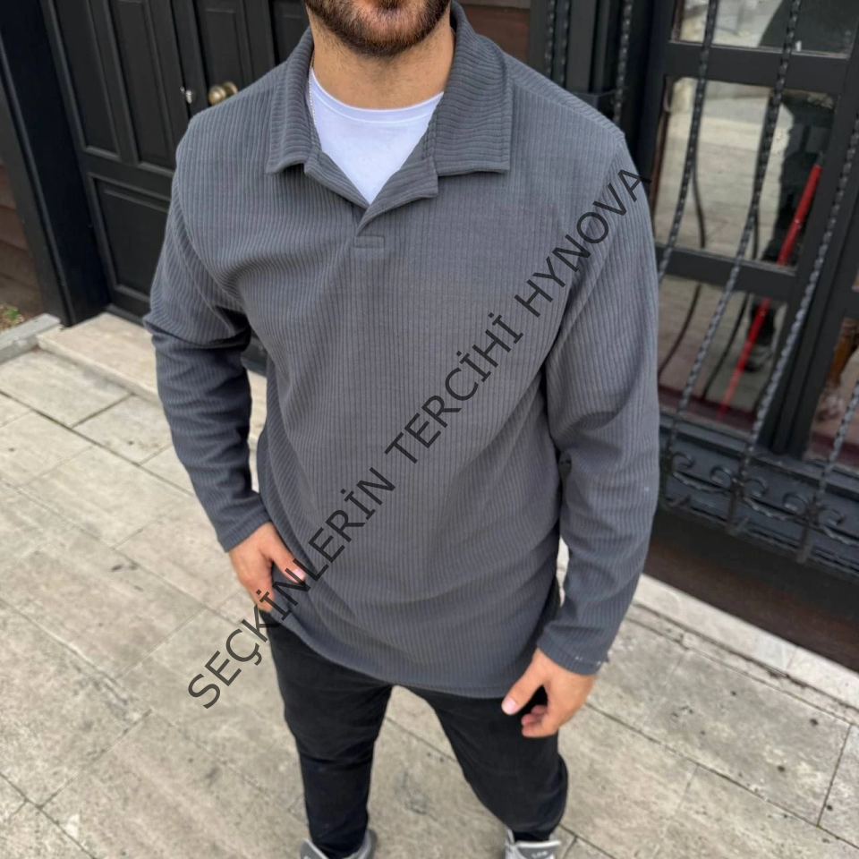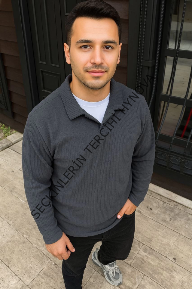 Erkek Fitilli Polar Sweatshirt – Düğmesiz Polo Yaka, Oversize Rahat Kalıp, Kalın Polar Kumaş, Kışlık Ve Baharlık Şık Günlük Üst - Füme