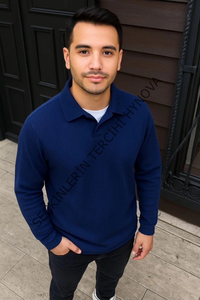 Erkek Fitilli Polar Sweatshirt – Düğmesiz Polo Yaka, Oversize Rahat Kalıp, Kalın Polar Kumaş, Kışlık Ve Baharlık Şık Günlük Üst - Lacivert