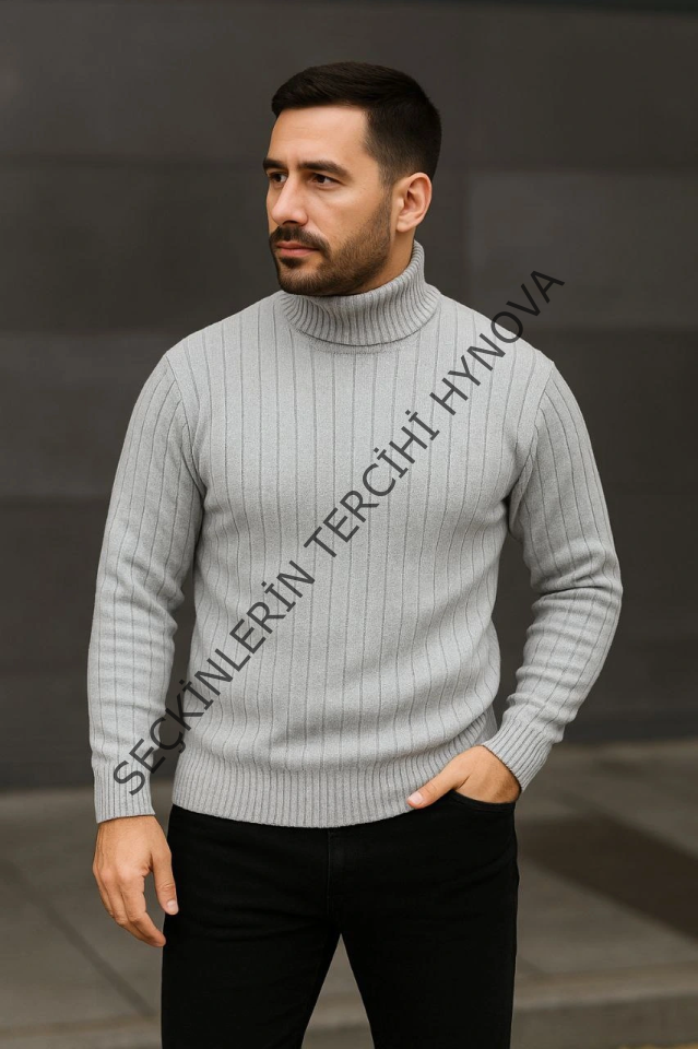 Erkek Fitilli Triko Kazak 3lÜ Set Gri Haki Siyah Regular Balıkcı Yaka Tam Boğazlı Triko Seti Modeli Kazak