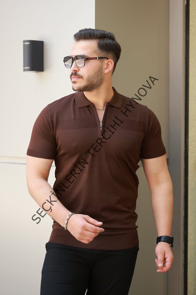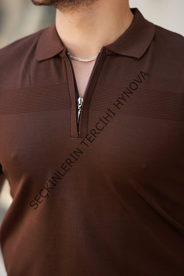 Erkek Göğüs Pirinç Desenli Fermuar Yakalı Kısa Kollu Tişört 164595