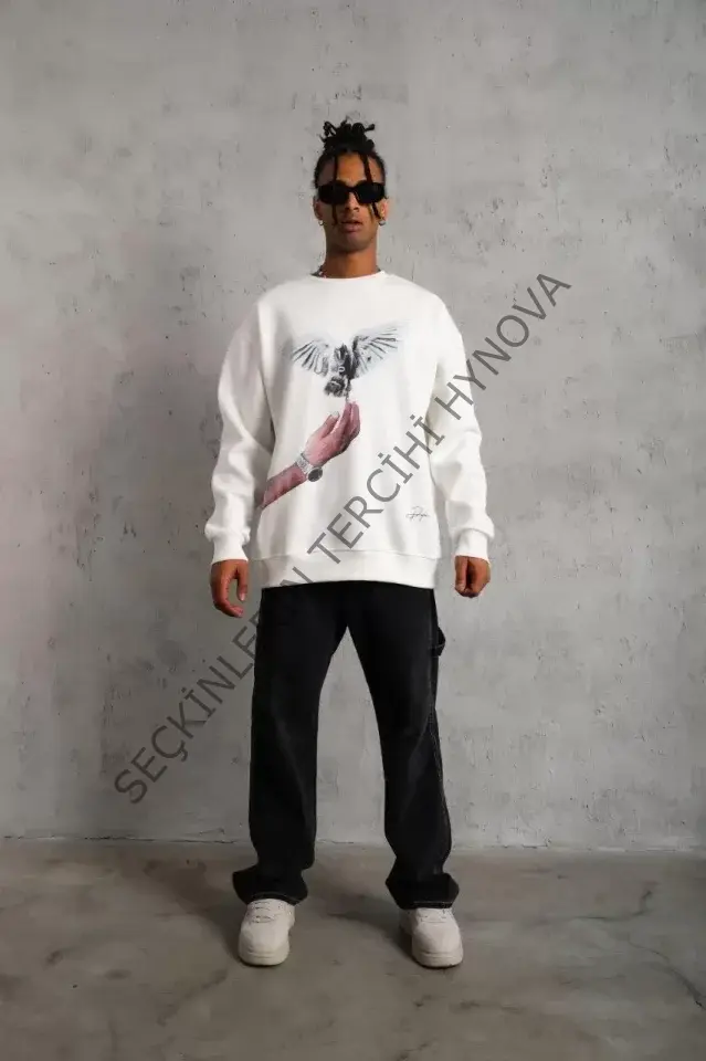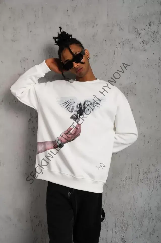 Erkek Güvercin Baskılı Sweatshirt - Beyaz