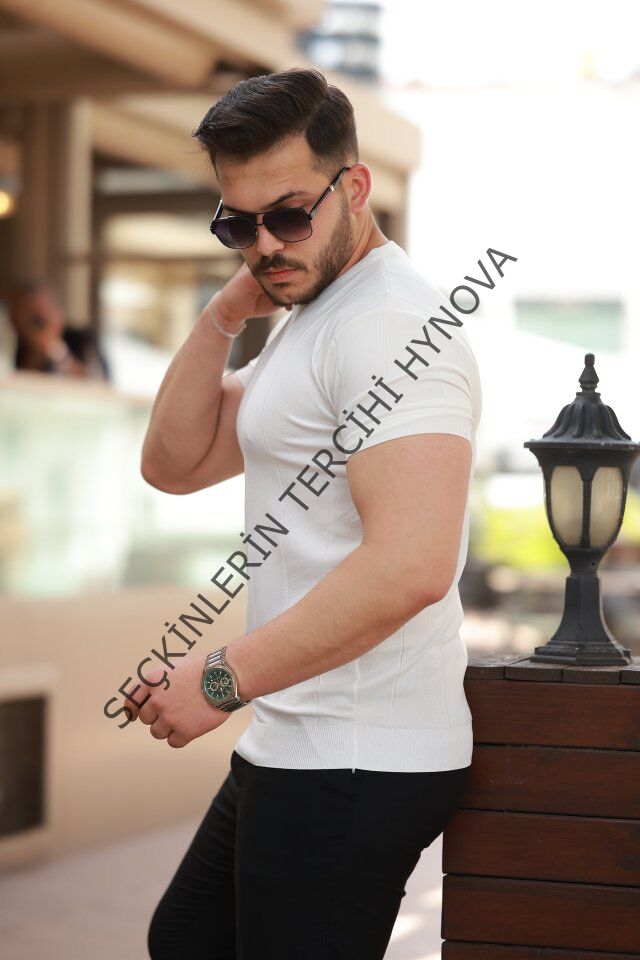 Erkek Ince çizgi Dokulu Bisiklet Yaka Kısa Kollu T-shirt