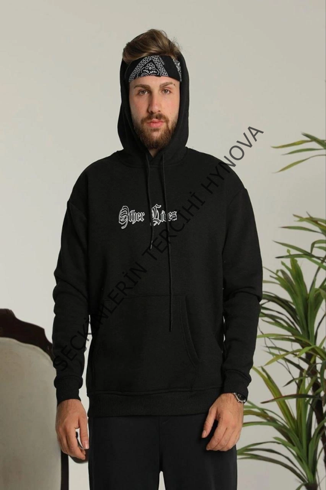 Erkek Kapşonlu Sweatshirt – Oversize Üç İplik Şardonlu Hoodie, “Other Lives” Ön - Arka Baskılı, Kanguru Cepli, Kışlık Rahat Günlük Stil - Siyah