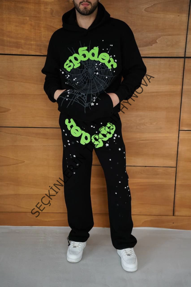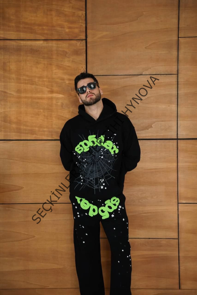 Erkek Kapüşonlu Eşofman Takım Örümcek Ağı Ve Neon Yeşil Baskılı Kanguru Cepli Oversize Rahat Kalıp, Premium Üç İplik Kumaş - Siyah