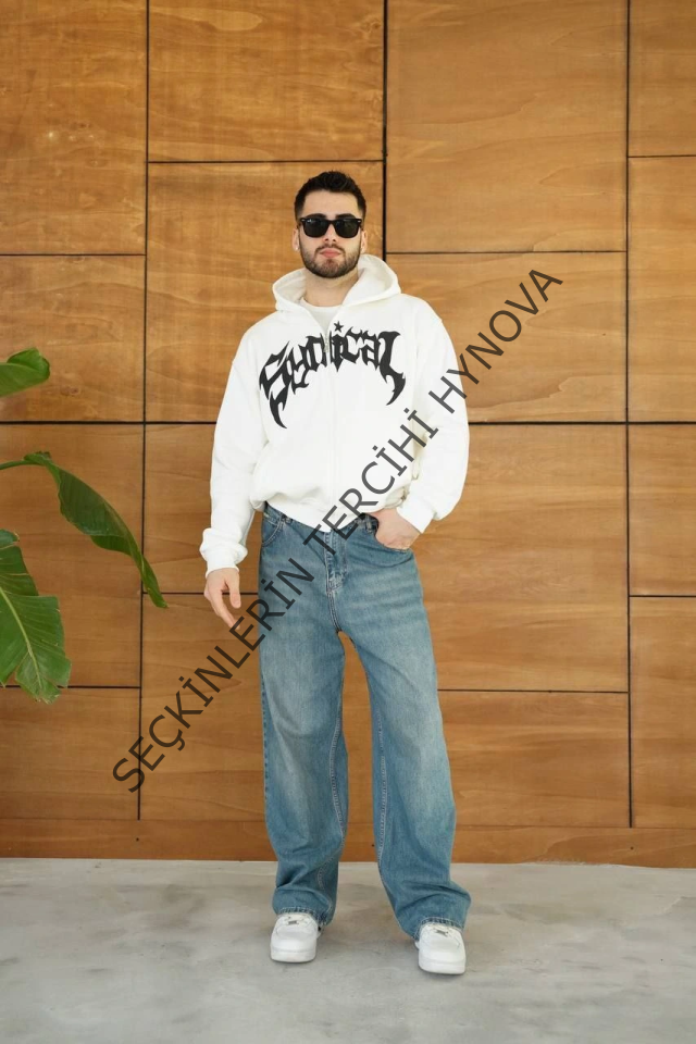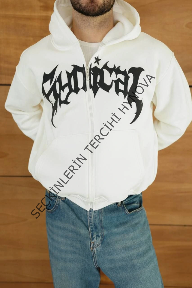 Erkek Kapüşonlu Sweatshirt Hoodie 3 İplik Şardonlu Pamuklu Kumaş, Önü Baskılı, Fermuarlı Rahat Kalıp, Kışlık Ve Sokak Stili Sweat - Beyaz