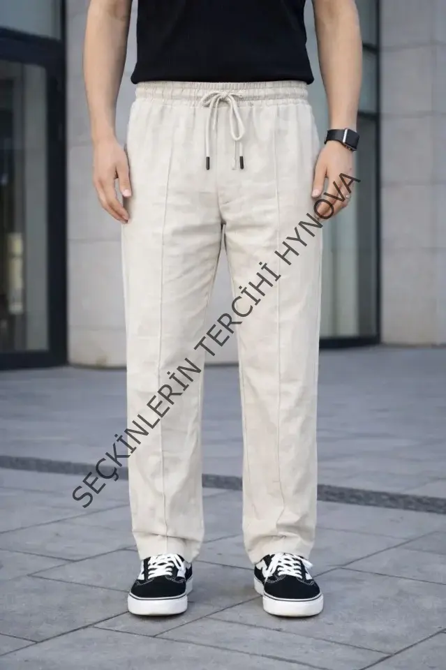 Erkek Keten Cepli Çıma Dikişli Jogger Buggy Pantalon Rahat Kalıp - Krem