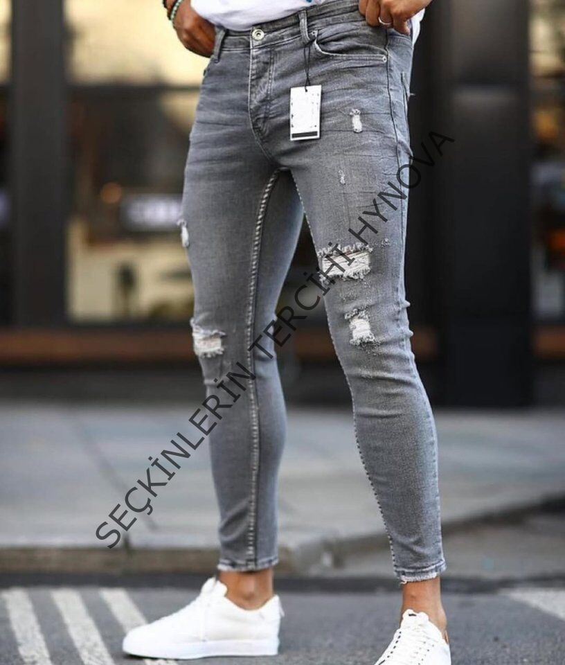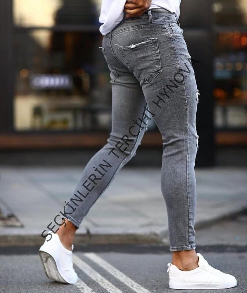 Erkek Koyu Gri Yırtık Detaylı Skinny Jean