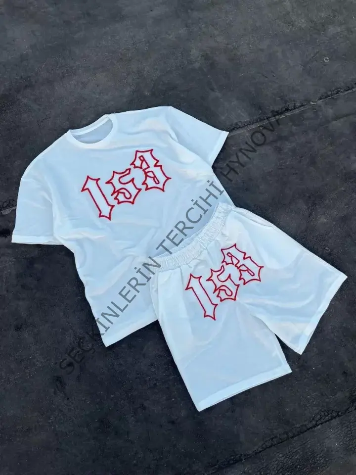 Erkek Nakış İşlemeli Şortlu Takım - Beyaz