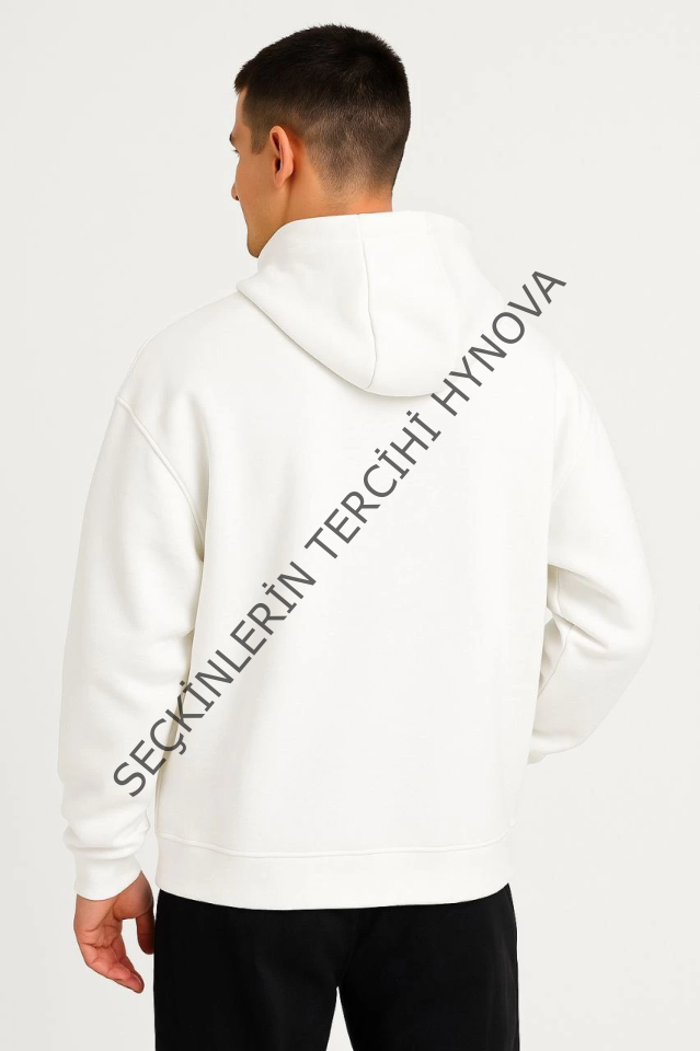 Erkek Ovarsize Kapüşonlu Swetshirt Kanguru Çepli Cıtcıtlı 3 Iplik Şardonlu Hoodie - Beyaz