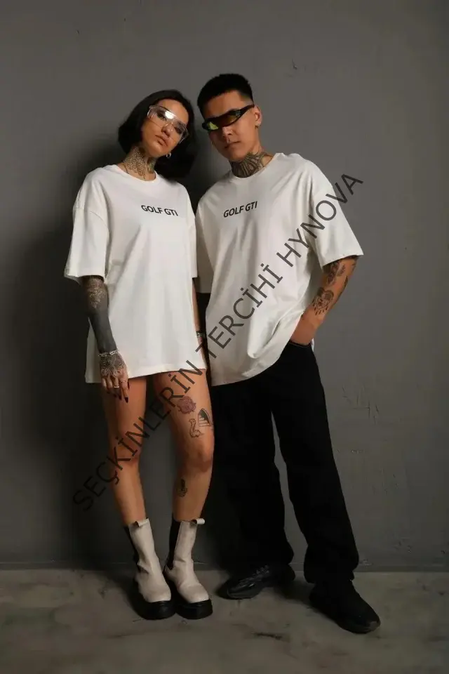 Erkek Oversize Baskılı Tişört – Golf GTI Retro Araba Desenli, Ön - Arka Dijital Baskı, Sokak Modası Stil - Beyaz