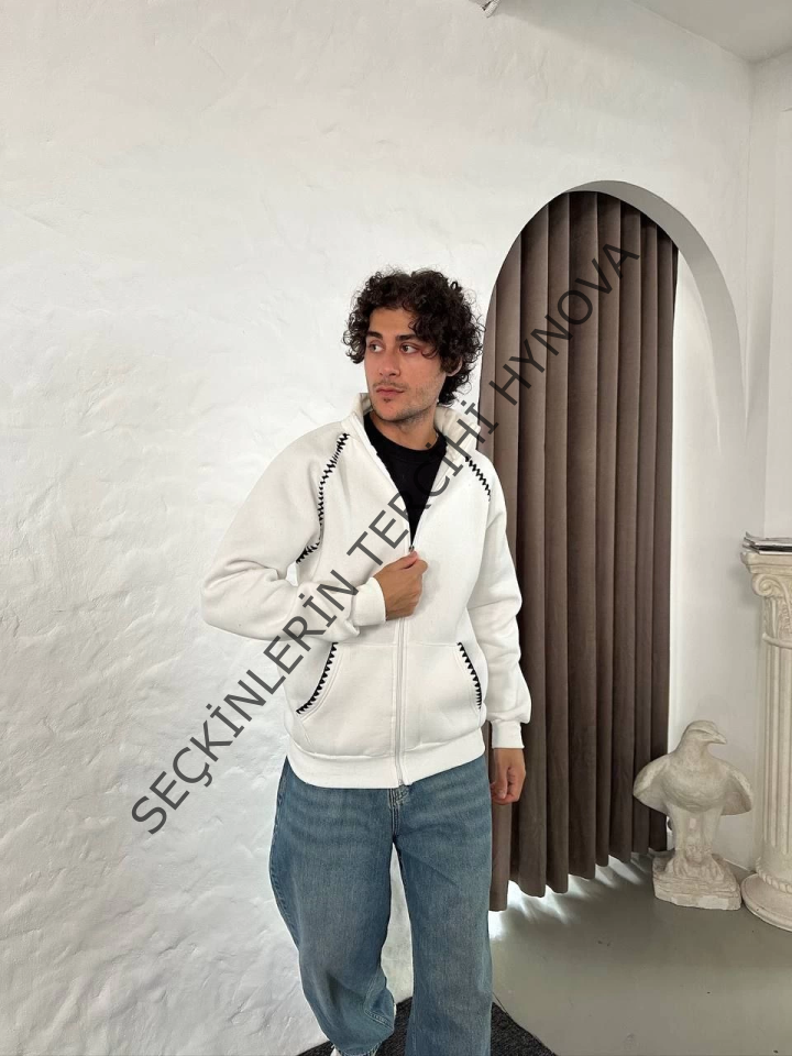 Erkek Oversize Dik Yaka Fermuarlı Sweatshirt - Zincir Nakışli Kanguru Cepli - Beyaz