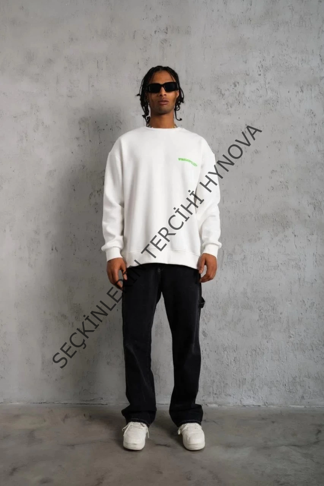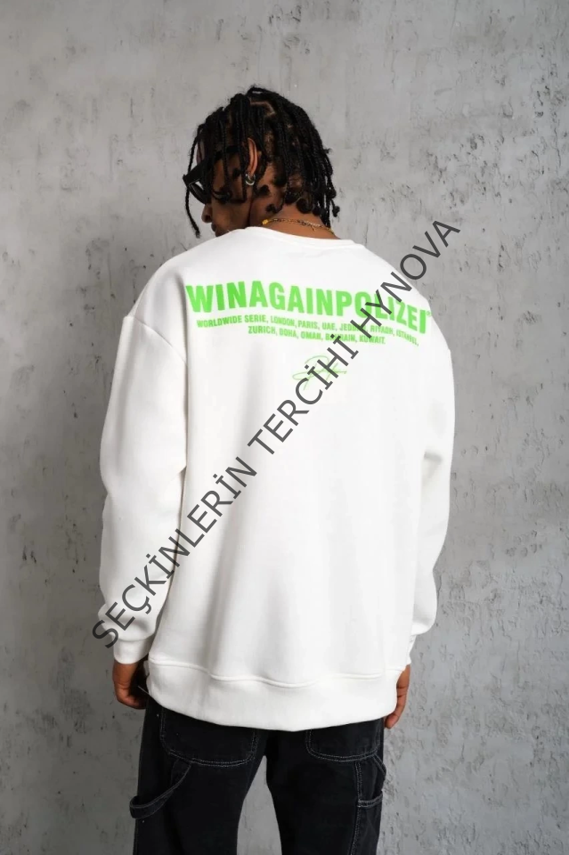 Erkek Oversize Sweatshirt – Beyaz Renk Ön Ve Sırt Baskılı, Üç İplik İçi Pamuklu Kumaş, Rahat Kalıp, Ribanalı Kışlık Sweat Winagain Polizei Serisi - Beyaz