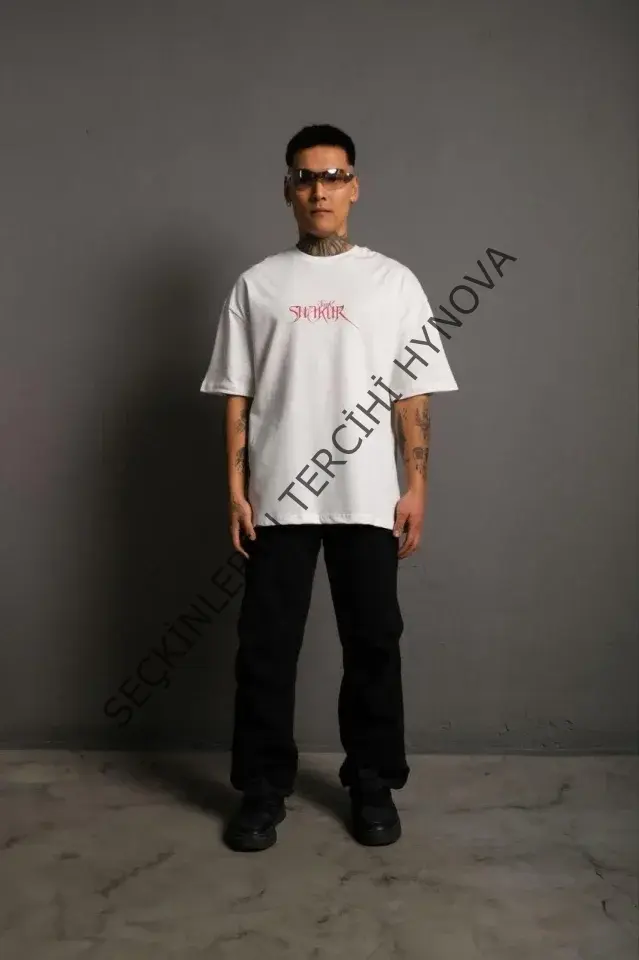 Erkek Oversize Tişört – Beyaz 24/1 Penye Kumaş, Bisiklet Yaka, Ön - Arka Baskılı, Streetwear Tarzı Rahat Büyük Kalıp T-Shirt- Beyaz