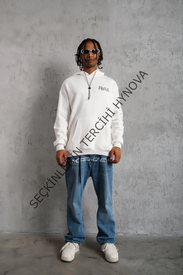 Erkek Oversize Üç İplik Kapüşonlu Sweat – Kol Ve Etek Ribana Detaylı, Ön Ve Sırt Baskılı, Kanguru Cepli Rahat Kalıp Model - Beyaz