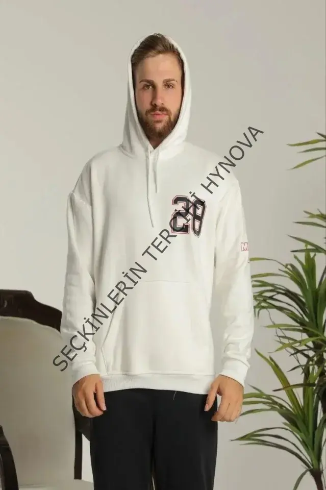 Erkek Oversize Üç İplik Kapüşonlu Sweatshirt –Sırt Ve Ön Baskılı, Kanguru Cepli, Rahat Kalıp Maskot Desenli Model - Siyah Beyaz