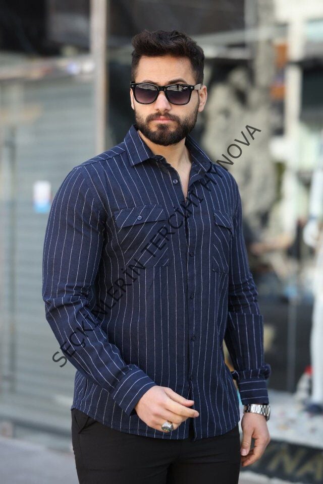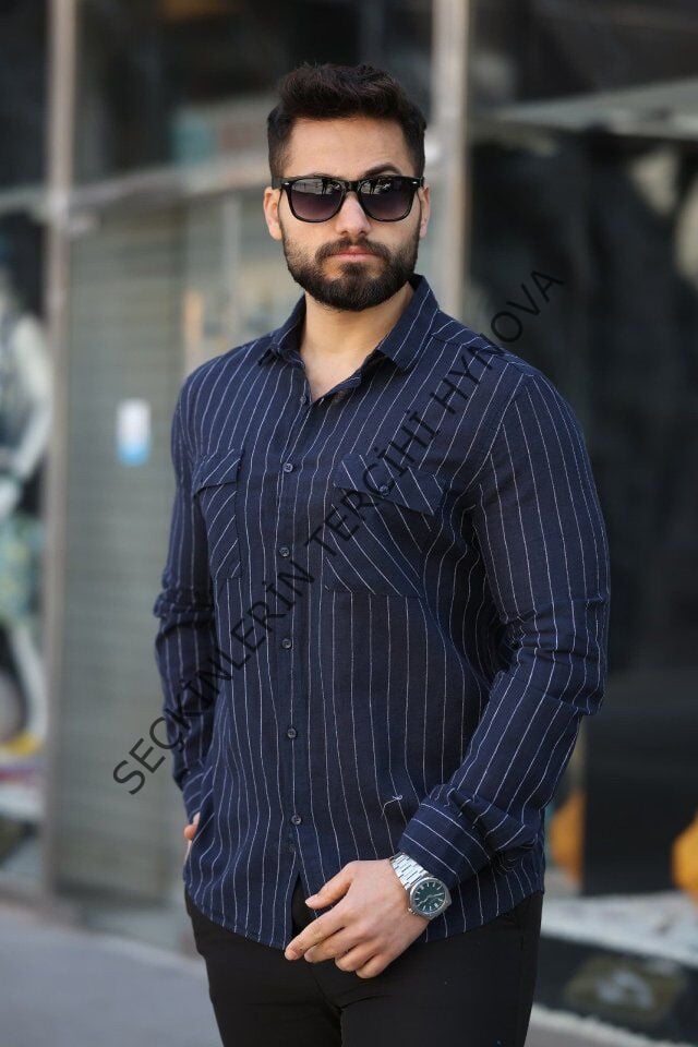 Erkek Pamuklu Çizgi Desenli Cep Detaylı Gömlek