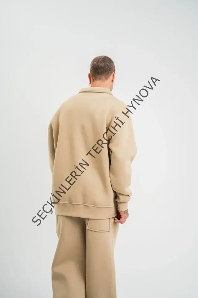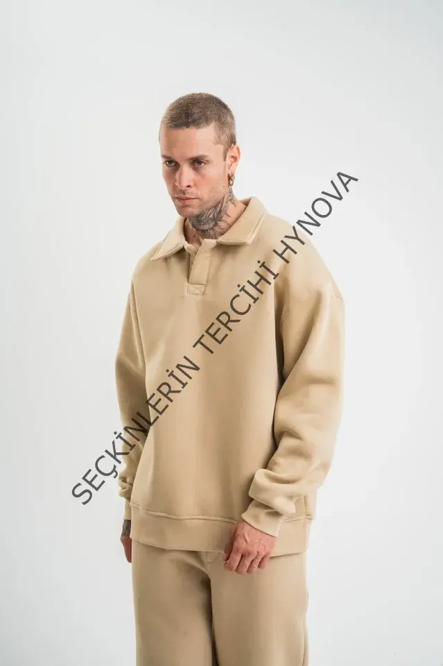 Erkek Patlı Yaka Üç İplik Pamuklu Sweatshirt Double Oversize Rahat Kalıp Günlük Kullanım – Bej