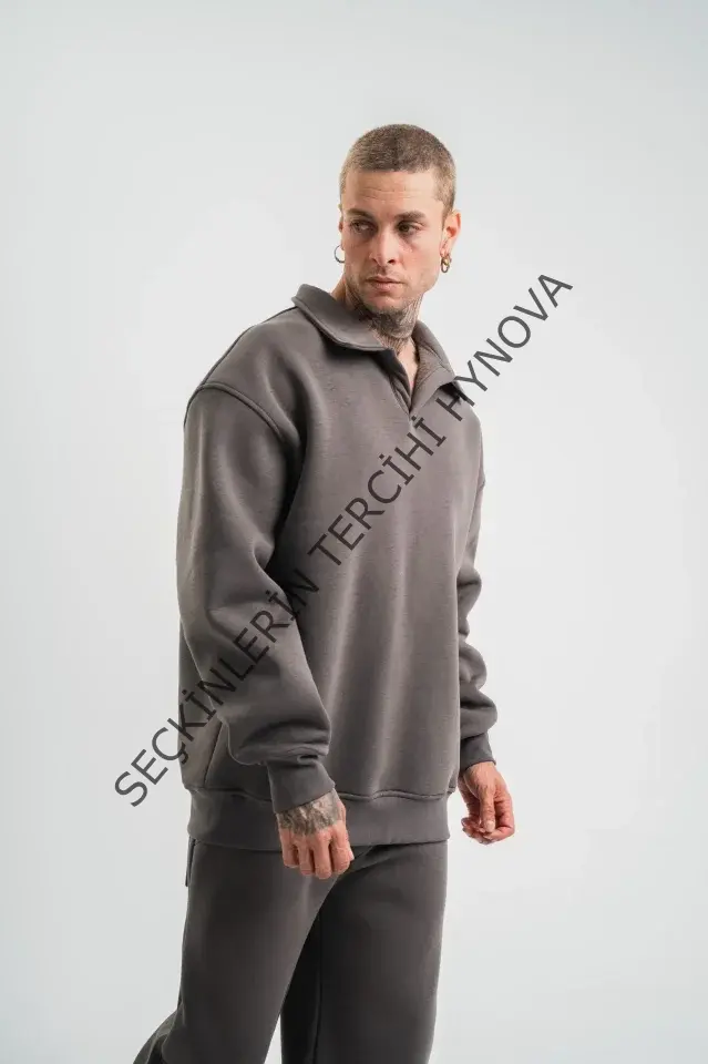 Erkek Patlı Yaka Üç İplik Pamuklu Sweatshirt Double Oversize Rahat Kalıp Günlük Kullanım - Füme