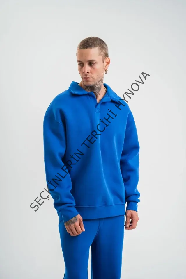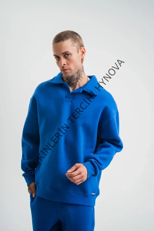 Erkek Patlı Yaka Üç İplik Pamuklu Sweatshirt Double Oversize Rahat Kalıp Günlük Kullanım - Mavi
