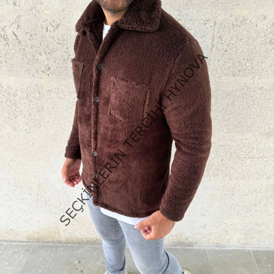 Erkek Pelüş Polar Hırka Gömlek – Yakalı, İlik Düğmeli, Göğüs Cepli, Yumuşak Dokulu Kışlık Regular Fit Rahat Günlük Model - Kahverengi