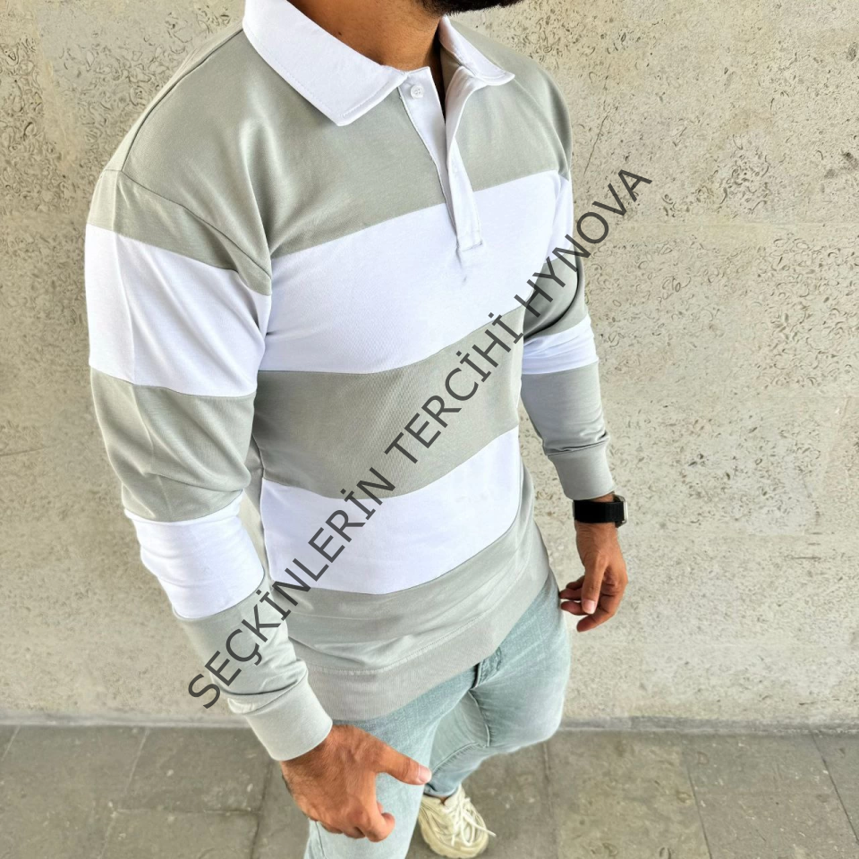 Erkek Polo Yaka Uzun Kollu Çizgili Sweatshirt Trend Rugby Stil - Mint Yeşili