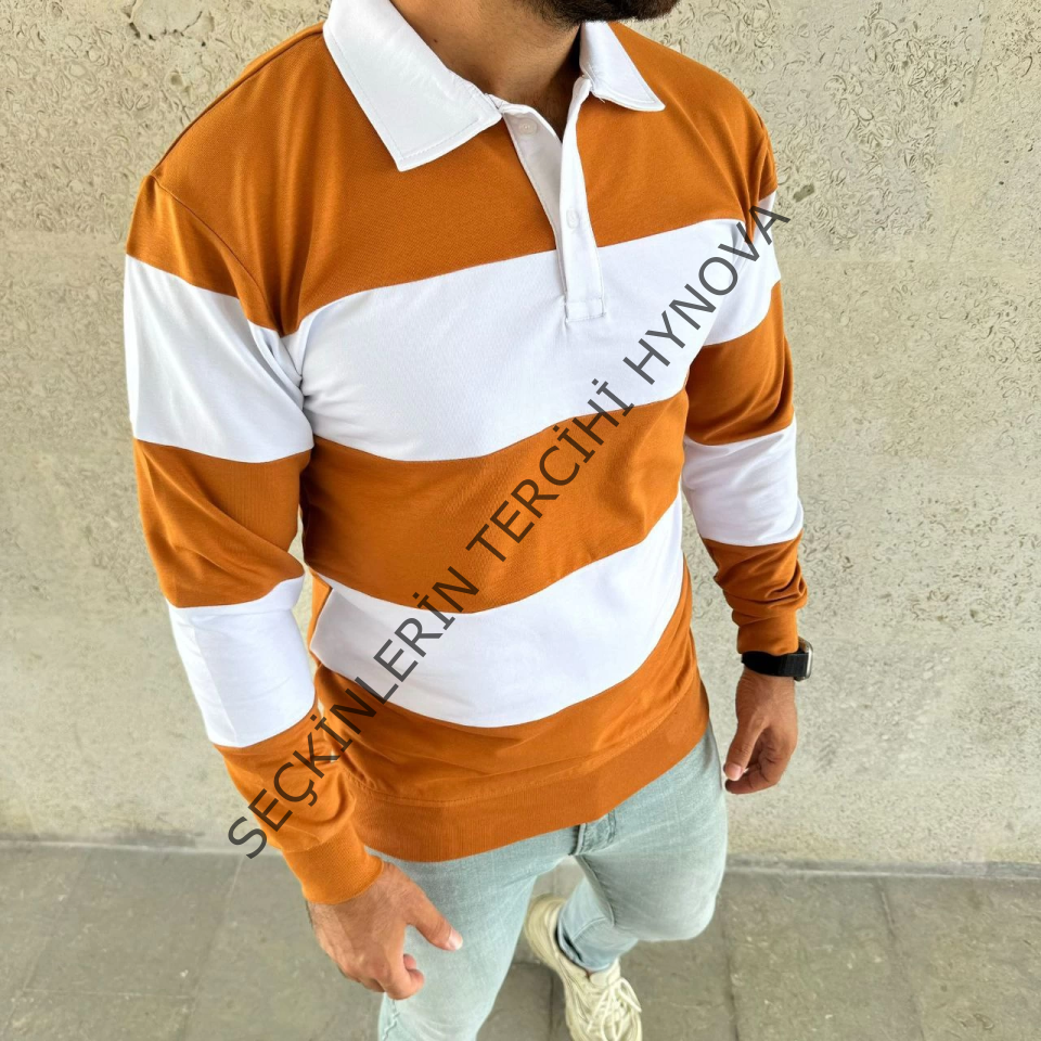 Erkek Polo Yaka Uzun Kollu Çizgili Sweatshirt Trend Rugby Stil - Turuncu