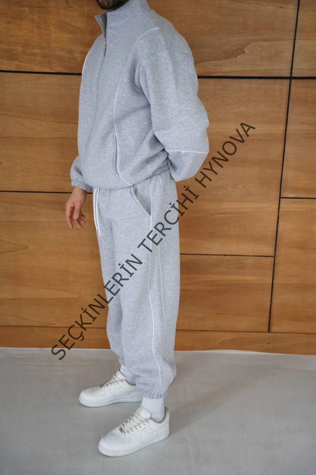 Erkek Premium Parçalı Eşofman Takım - Dik Yaka Fermuarlı Biyeli Sweatshirt Lastik Paça Alt, Oversize 3 Iplik Şardonlu - Gri