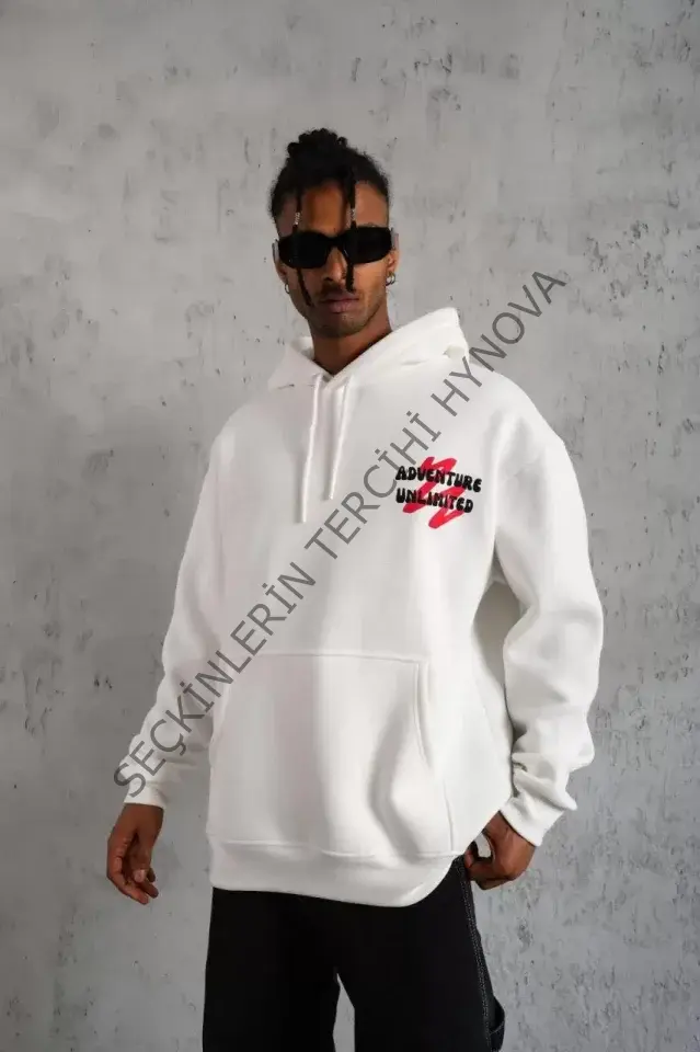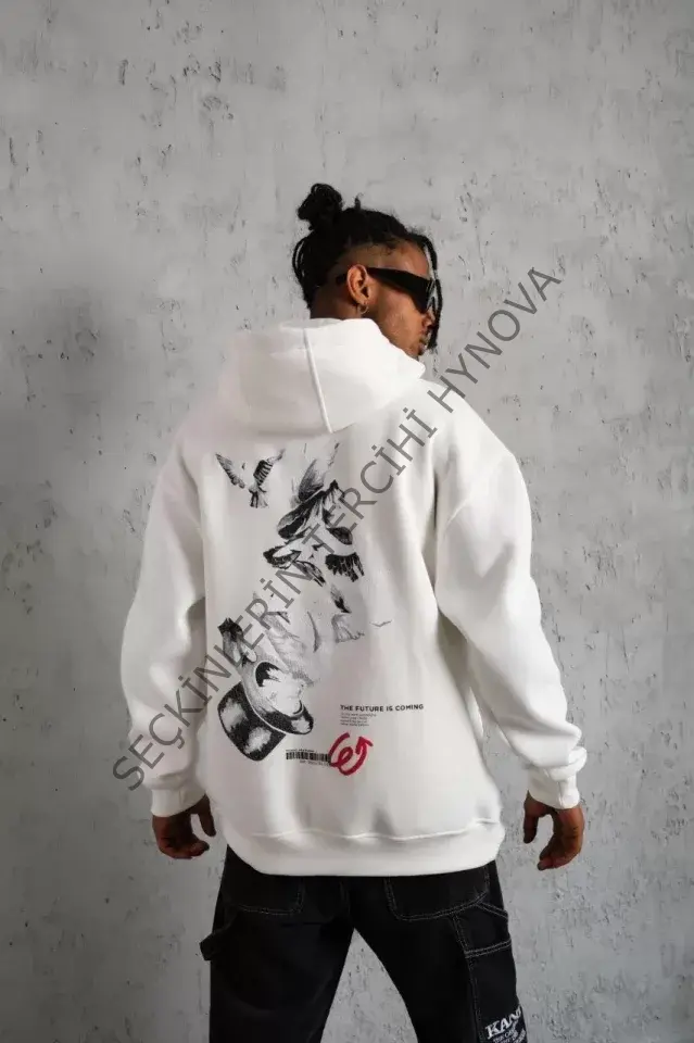 Erkek Şapkalı Güvercin Baskılı Kapşonlu Sweat - Beyaz